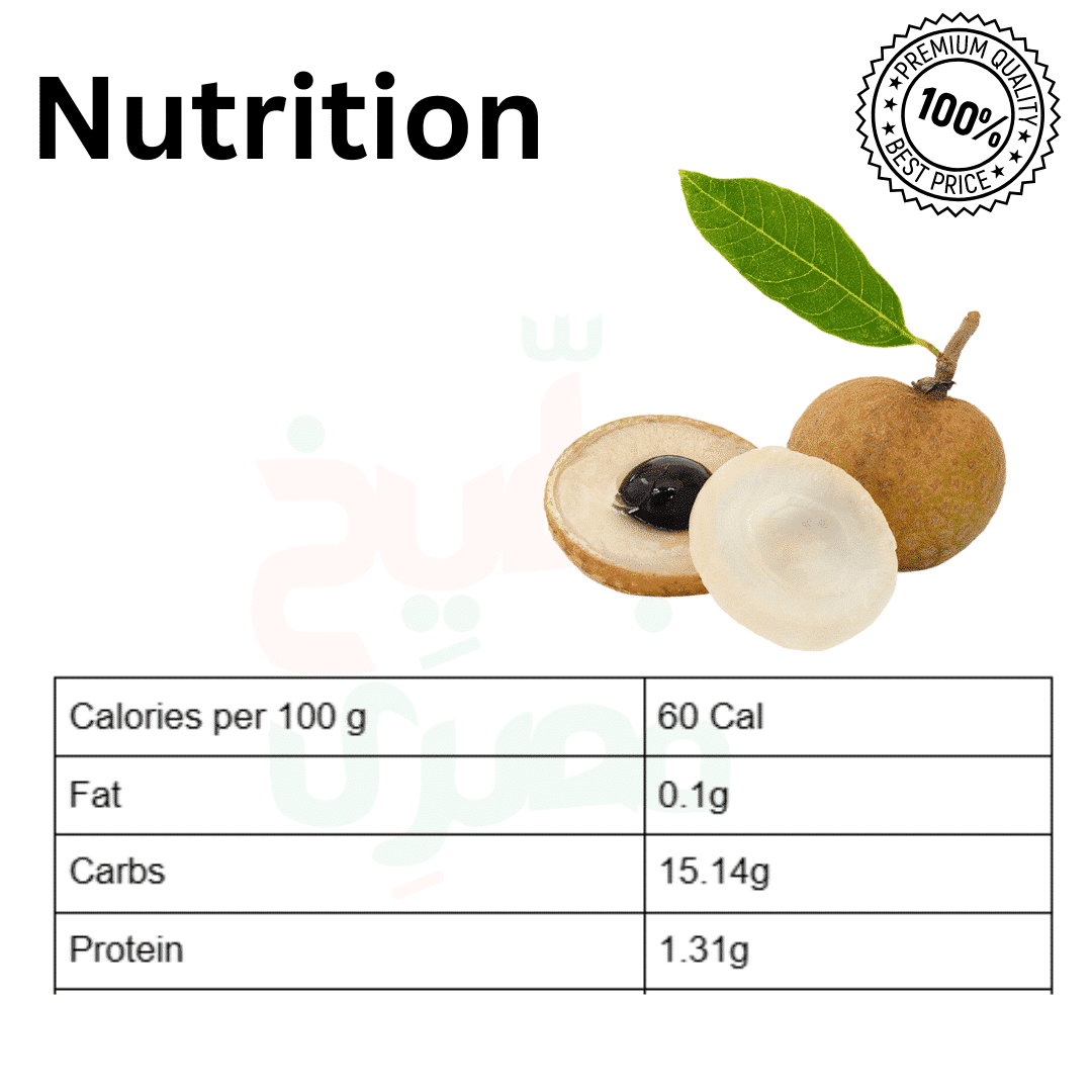 اللونجان غني جدا بالمغذيات ويحتوي على الكثير من فيتامين سي والبوتاسيوم ويحتوي اللونجان علي 60 سعر حراري لكل 100 جرام ودهون صحية 0.1 جرام و 15.14 جرام من الكربوهيدرات و 1.31 جرام بروتين