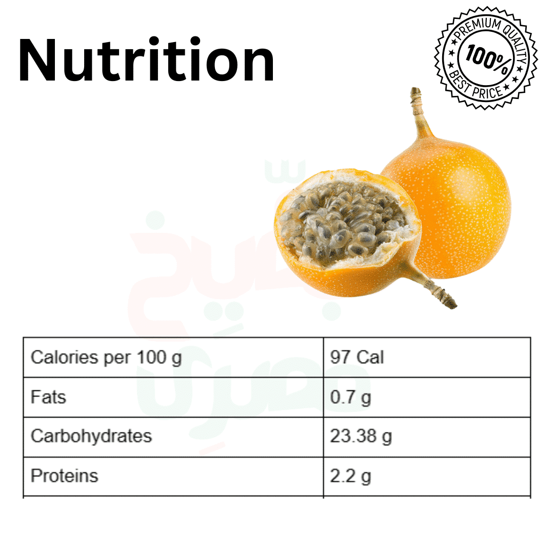 تحتوي الجراناديلا علي 97 سعر حراري لكل 100 جرام و23.38 جرام من الكربوهيدرات و 2.2 جرام بروتين و 0.7 جرام دهون صحية